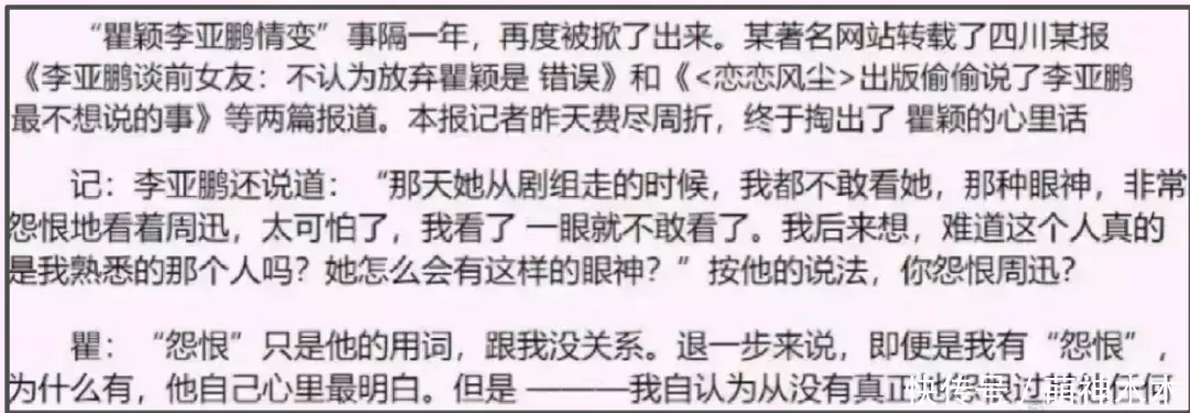 ——瞿颖被分手了跨城找朋友哭诉,周迅被分手了抑郁许久,李亚鹏和瞿颖、周迅纠缠期间,还有过一篇经典报道,李亚鹏竟然暗示记者,瞿颖非常怨恨周迅,来了一句:“……我都不敢看她,那种眼神,非常怨恨地看着周迅,太可怕了……”